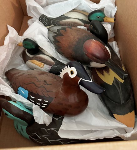 FURNITURE AND HOME ACCESSORIES: Oak display cabinet with beveled glass doors, Midcentury Spanish bedroom suit, vintage rocking chair, lane cedar chest, oak poster bed, midcentury 4 drawer chest, two midcentury sofas, two dining room tables w/ chairs, miscellaneous living room tables and straight chairs, angel statues, wooden and ceramic ducks, miscellaneous framed pictures and prints, wooden and brass carousel horses. BRASS: horses, deer, fish, ducks, candles sticks, and other home accessories, metal closet, miscellaneous upholstered sofas, wingback chairs, recliners, miscellaneous coffee tables and end tables, marble base plant stand, area rugs, and loads of home accessories.
